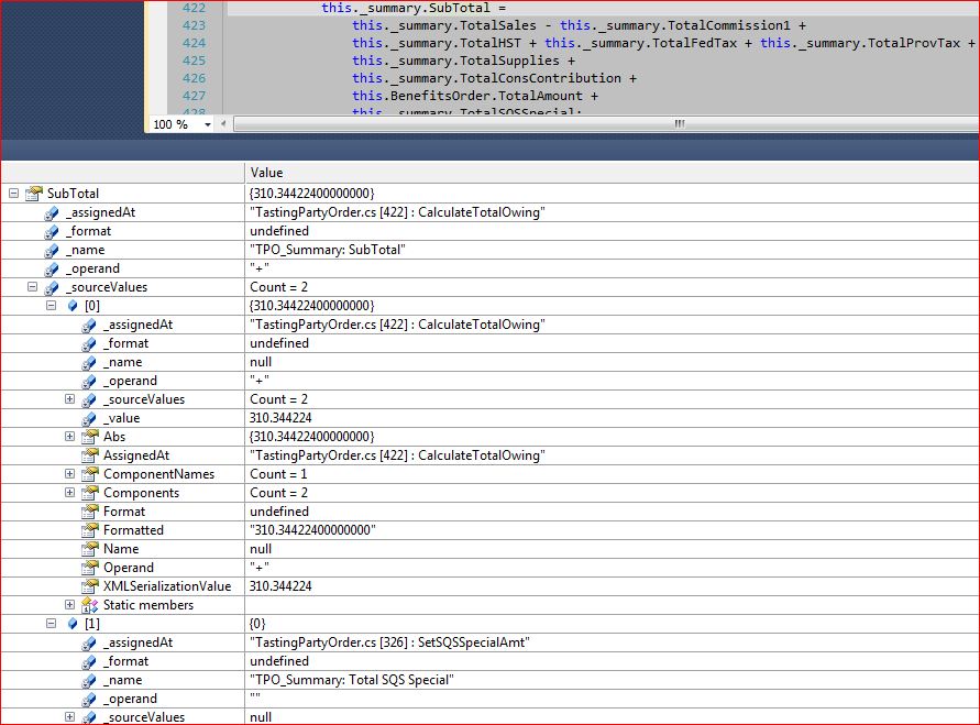 In this case, we are looking at the variable SubTotal. The locals window shows that the current value of the variable is 310.344224. It is also possible to see that the last operation that occurred was that we added (_operand) two source values (_sourceValues) of 341.344224 and 0. The 0 comes from a value named “TPO_Summary: Total SQS Special” (which represents the variable TotalSQSSpecial that appears as the last value in the add at line 422). The 341.344224 came from an unnamed value (in fact, this is the result of the 8 additions and subtractions that precede the addition of the TotalSQSSpecial).