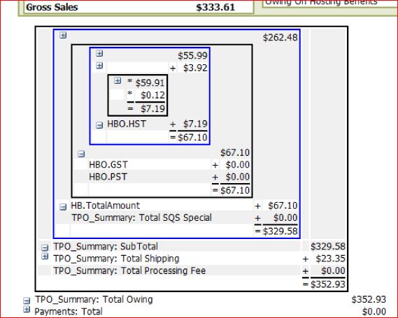 In this image it is possible to see that the “Total Owing” was created by adding 3 values together ($329.58+$23.35+$0.00). One of the values (TPO_Summary: SubTotal) is further broken down to show that it is derived from the addition of 3 values ($262.48+$67.10+$0.00). And so on.